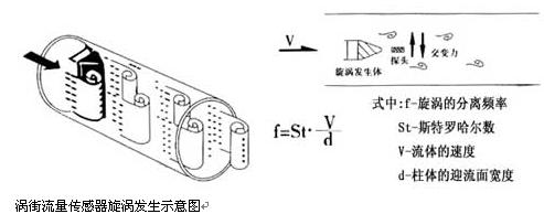 一定雷諾數(shù)范圍內(nèi)(2×104~7×106 ),旋渦的釋放頻率f與流體流速V及旋渦發(fā)生體的迎流面寬度d之間關(guān)系式為f=St?v/d,式中St 為斯特勞哈數(shù),它是一個無量綱的系數(shù),只要準確測出頻率f,就可以求得流體流速v,由v求出體積流量。