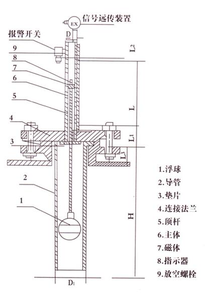 UDZ-5頂裝式磁翻板液位計是應(yīng)需集中控制而開發(fā)的另一種頂裝(底裝)型產(chǎn)品,具有現(xiàn)場指示清晰又能遠傳控制等優(yōu)點.該產(chǎn)品能廣泛應(yīng)用于石油化工、化肥、醫(yī)藥、船舶、軍事等行業(yè)中的各種塔、罐、槽及球形容器上的液位指示。頂裝式磁翻板液位計由本體(由上、下導管組成)、翻板箱(由紅、白雙色磁性小翻板組成)、浮子(由磁體、頂桿、浮筒組成)以及液位變送器等組成,其結(jié)構(gòu)如圖所示。工作原理為:容器內(nèi)的浮筒(按不同介質(zhì)和壓力針對),在下導管中隨液面高度的變化而上下浮動并通過頂桿使磁體在上導管內(nèi)上下移動,促使本體外的翻板翻動并用紅、白顏色來指示液面高度,同時液位變送器將液位信號傳送至控制中心進行液位指示和控制,也可通過計算機進行集中監(jiān)控。