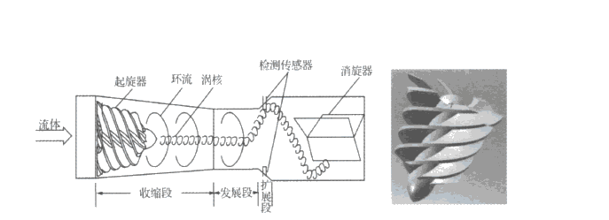 在流量計入口處裝有螺旋形導(dǎo)流葉片,流體進(jìn)入后會產(chǎn)生激烈的螺旋旋轉(zhuǎn),進(jìn)入擴散腔后流體會發(fā)生二次旋轉(zhuǎn),氣體旋轉(zhuǎn)后撞擊流量計內(nèi)壁產(chǎn)生振動頻率,振動頻率是和流量成正比的。當(dāng)流量計設(shè)計得當(dāng)時,在很寬的流量范圍內(nèi),旋渦的頻率與流量成線性關(guān)系,該頻率由壓電傳感器檢測,由流量積算儀進(jìn)行運算和處理,可以輸出4~20mA信號。