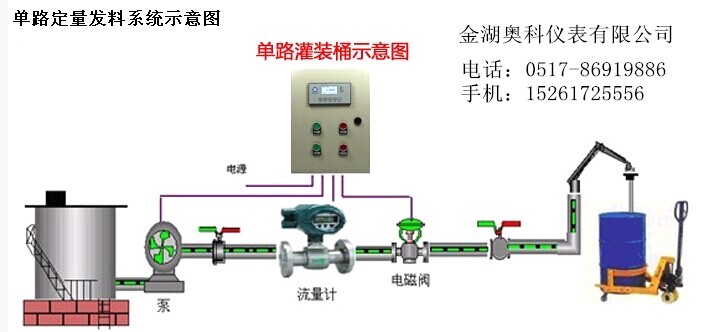 江蘇奧科儀表有限公司提供本方案主要根據(jù)流量計反饋給定量控制儀的脈沖流量信號,當(dāng)流量累計流量達到設(shè)定的數(shù)值(定量值),定量控制儀會給電磁閥門或泵一個開關(guān)信號,已達到對閥門、泵的啟動和關(guān)閉控制。實現(xiàn)對加料  的自動和手動控制。該系統(tǒng)精度高,操作簡單,可現(xiàn)場校準(zhǔn)目前很多企業(yè)都會用到或者是都需要改進的項目之一,它把具有操作簡便易學(xué),顯示直觀,手動控制流量或自動控制流量相結(jié)合等特點。特別適用于油田摻油、摻水、摻藥、配料、定量注水及各種液體的定量控制。目前一些現(xiàn)在仍采用人工操作罐裝/打料,同時也不想投入太多成本,就想提高工作效率的企業(yè)建議采用本系統(tǒng)。